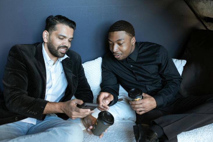• Two men enjoying coffee during a relaxed business meeting indoors.